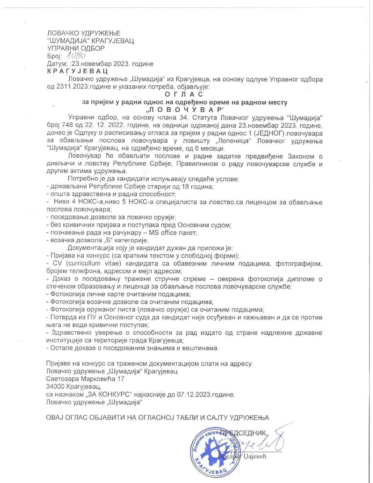 ОГЛАС ЗА ПРИЈЕМ У РАДНИ ОДНОС НА ОДРЕЂЕНО ВРЕМЕ НА РАДНОМ МЕСТУ - ЛОВОЧУВАР
